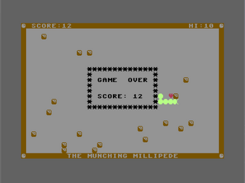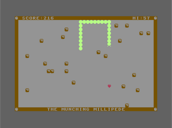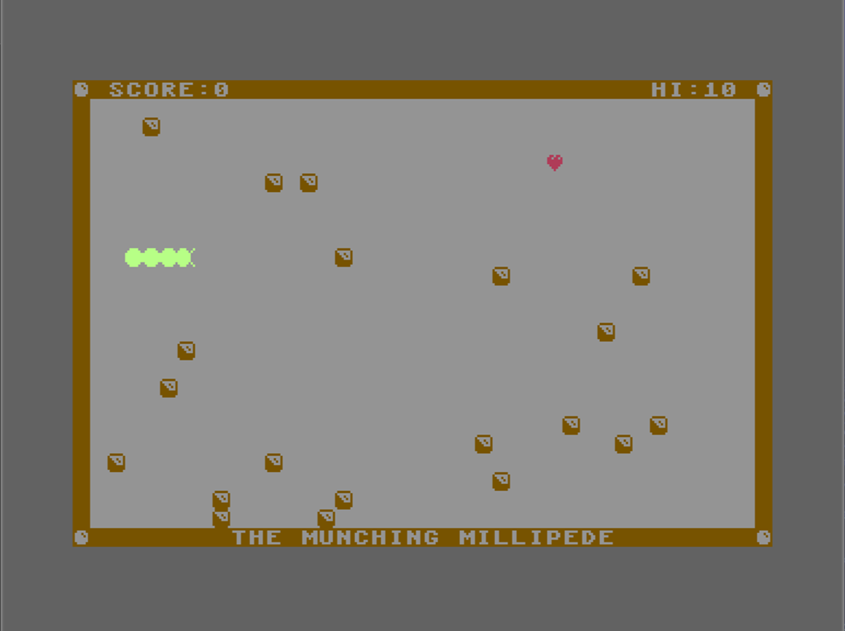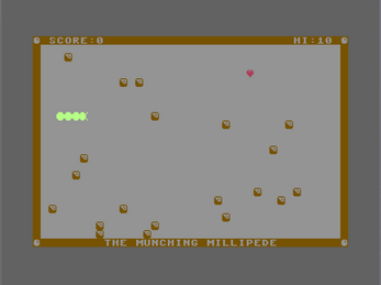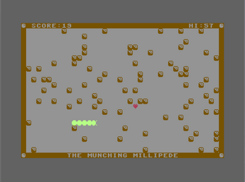 The Munching Millipede game is written in Commodore BASIC 2.0 for the Commodore 64. The web port on this page is written in JavaScript and intended to look and feel like the C64 version, but is a demo and doesn't contain everything, such as sound.