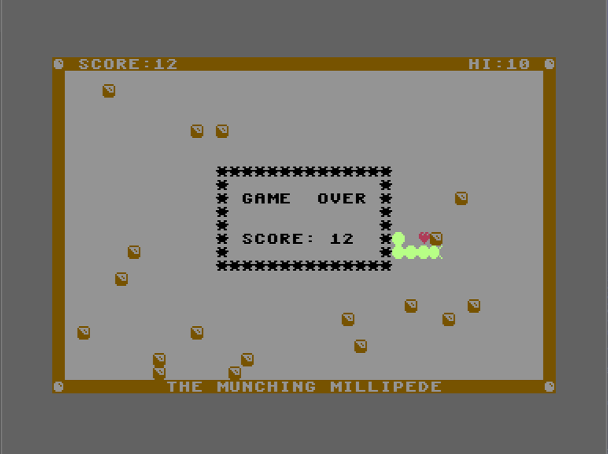 I totally agree, C64 games and joysticks just go together. Unfortunately, the lack of joystick here was purely due how unresponsive it was during testing. The game running in BASIC just doesn't loop fast enough to capture the joystick input as it happens. This leads having to hold it in the direction you want to go to get it to work, making fast direction changes almost impossible. The keyboard on the other hand is read from the buffer where the last 10 keystrokes are stored. This allows you to type all of you next moves fast and watch the millipede perform them on its next moves, making U-turns and other multi direction changes easy to pull off. I think the only way to be able to replicate this with the joystick would be a complete rewrite of the game in Assembly language, as the game loop would run 100x times faster.